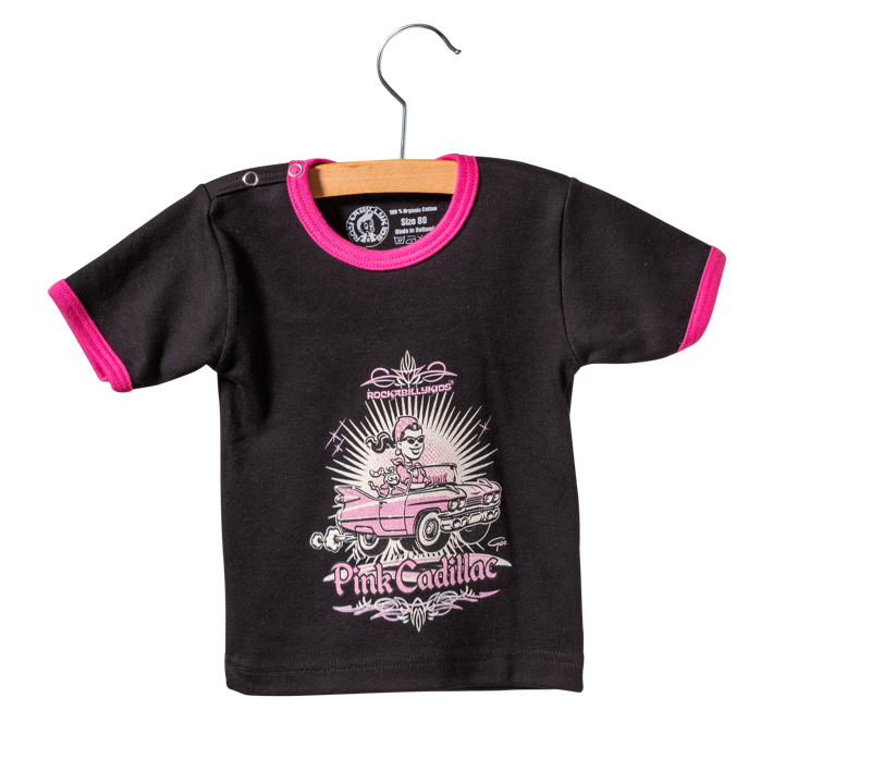 Rockabillykids shirt, zwart / roze met originele illustratie van Ger Peters.