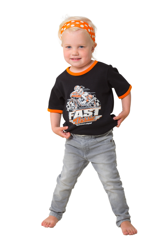 Rockabillykids shirt, zwart / oranje met originele illustratie van Ger Peters.